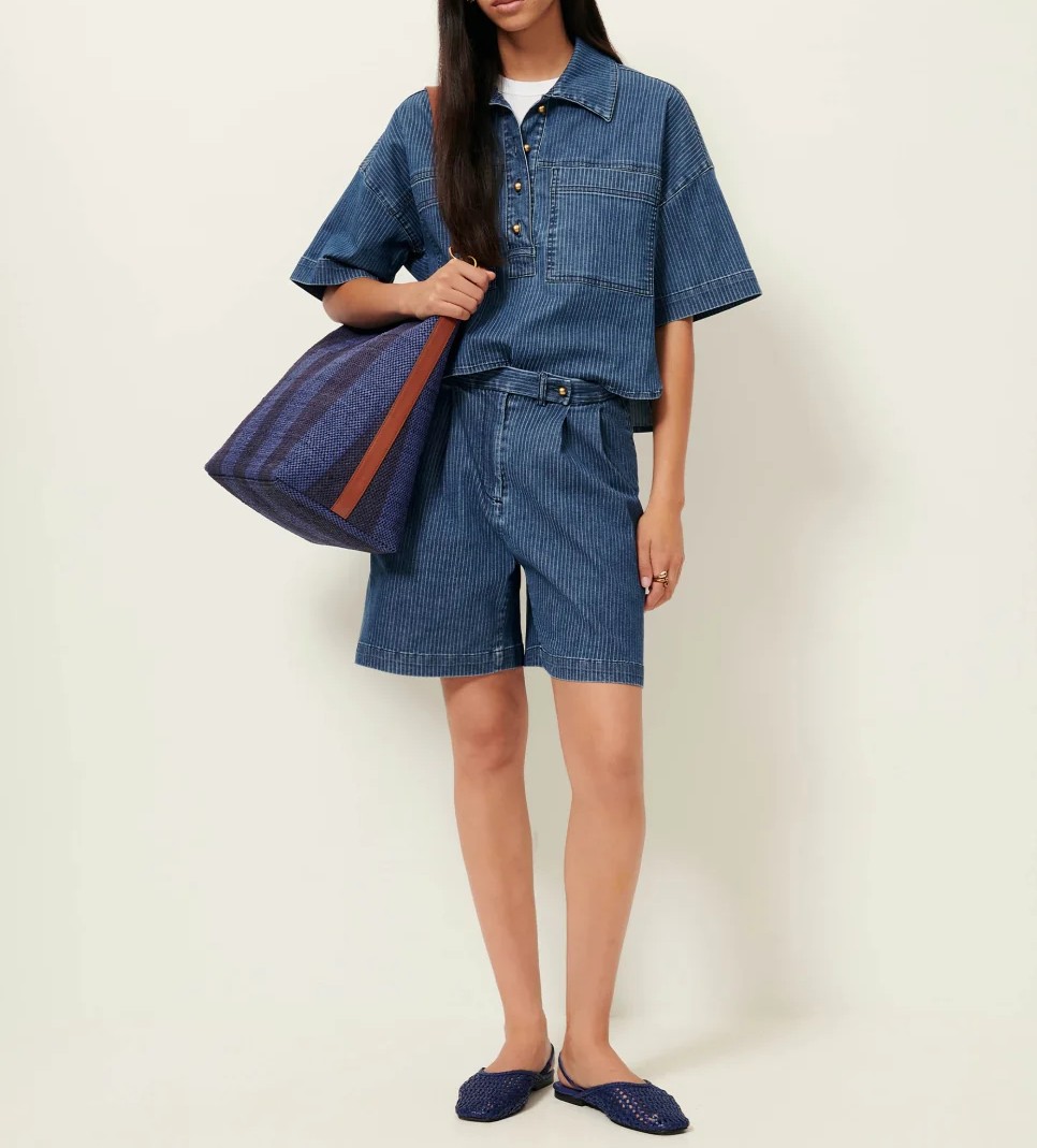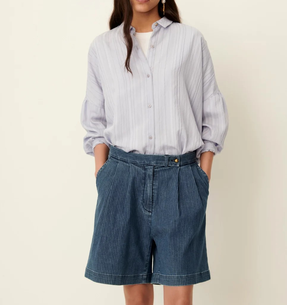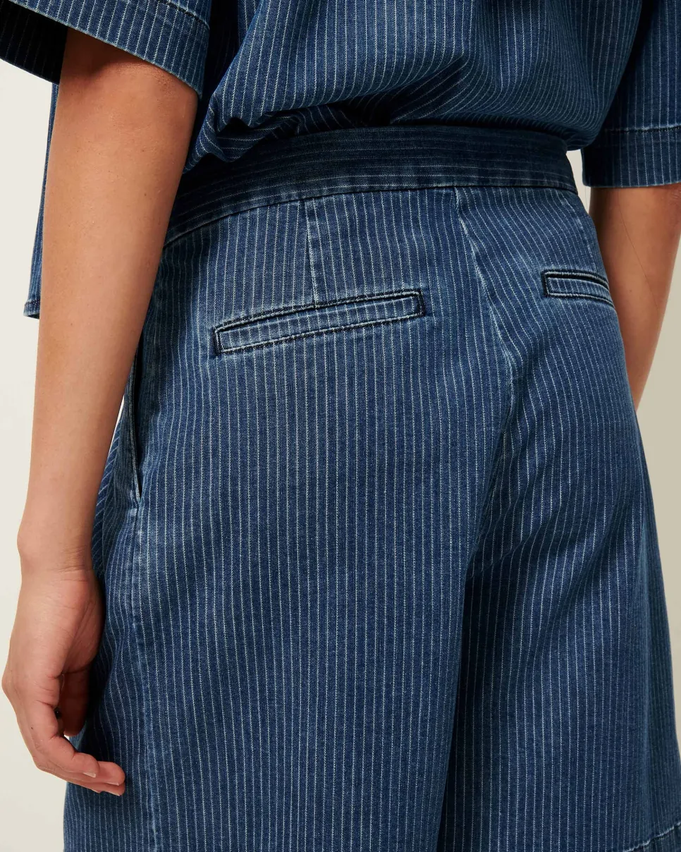 Bermuda à plis en sergé de denim à fils indigo et fines rayures contrastées