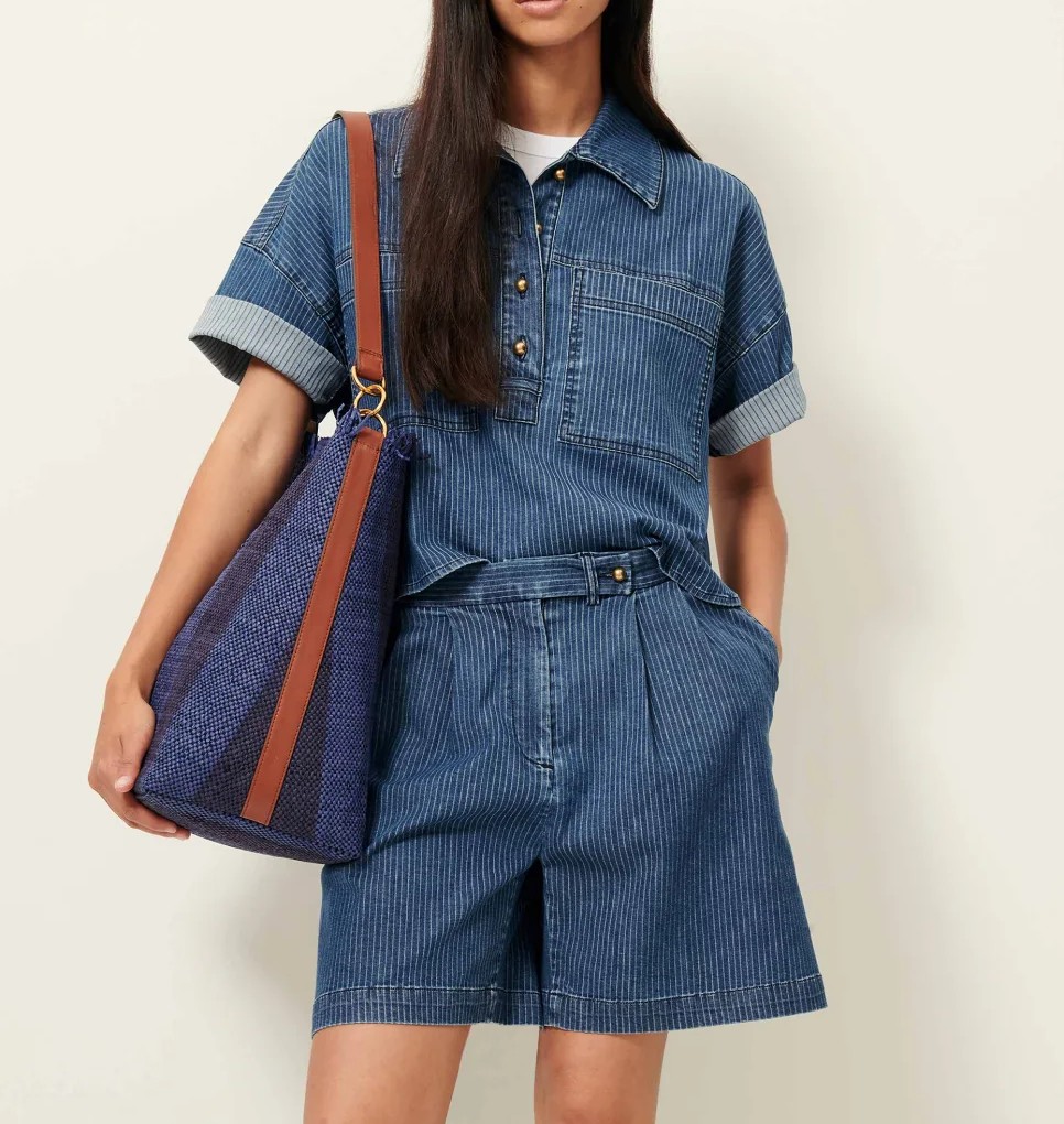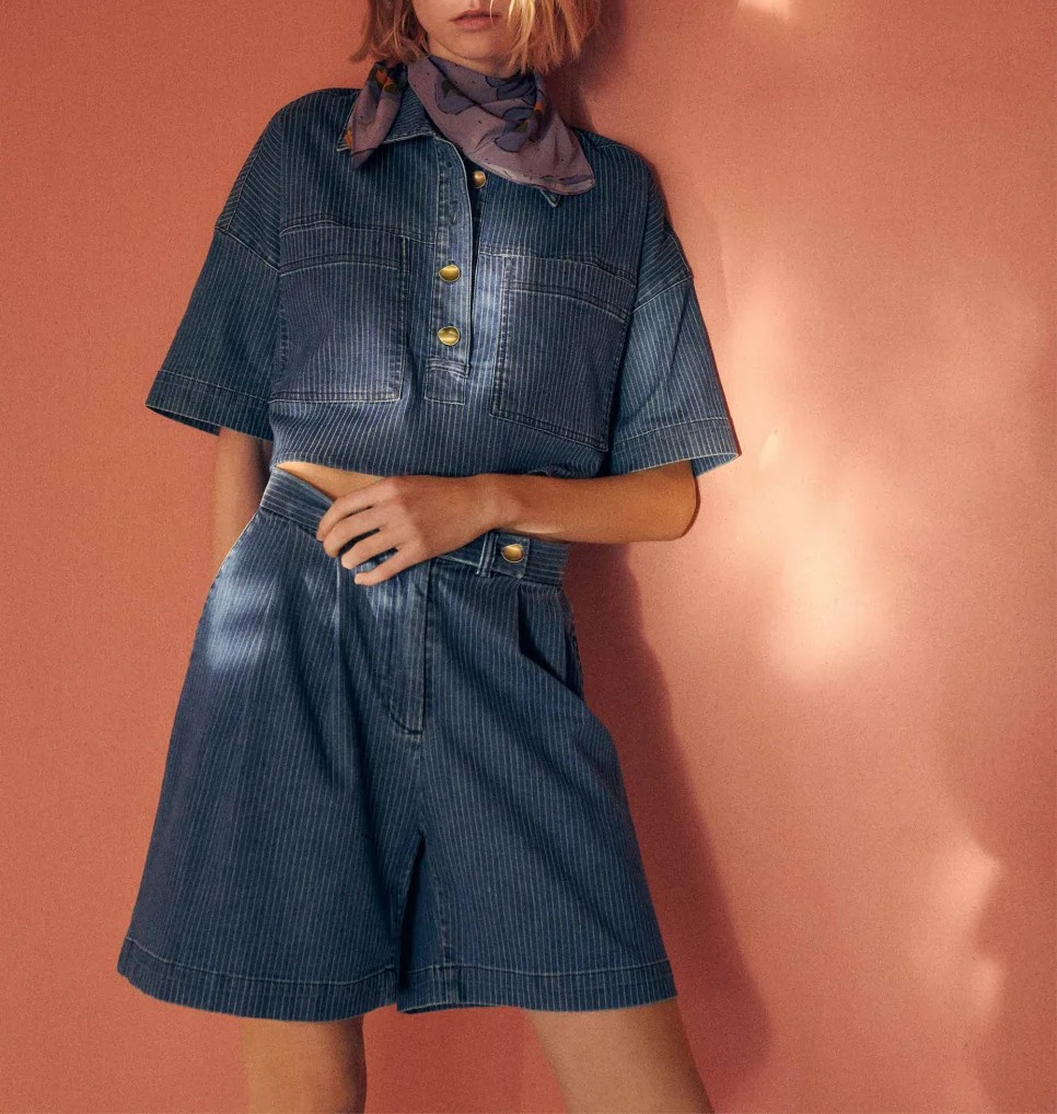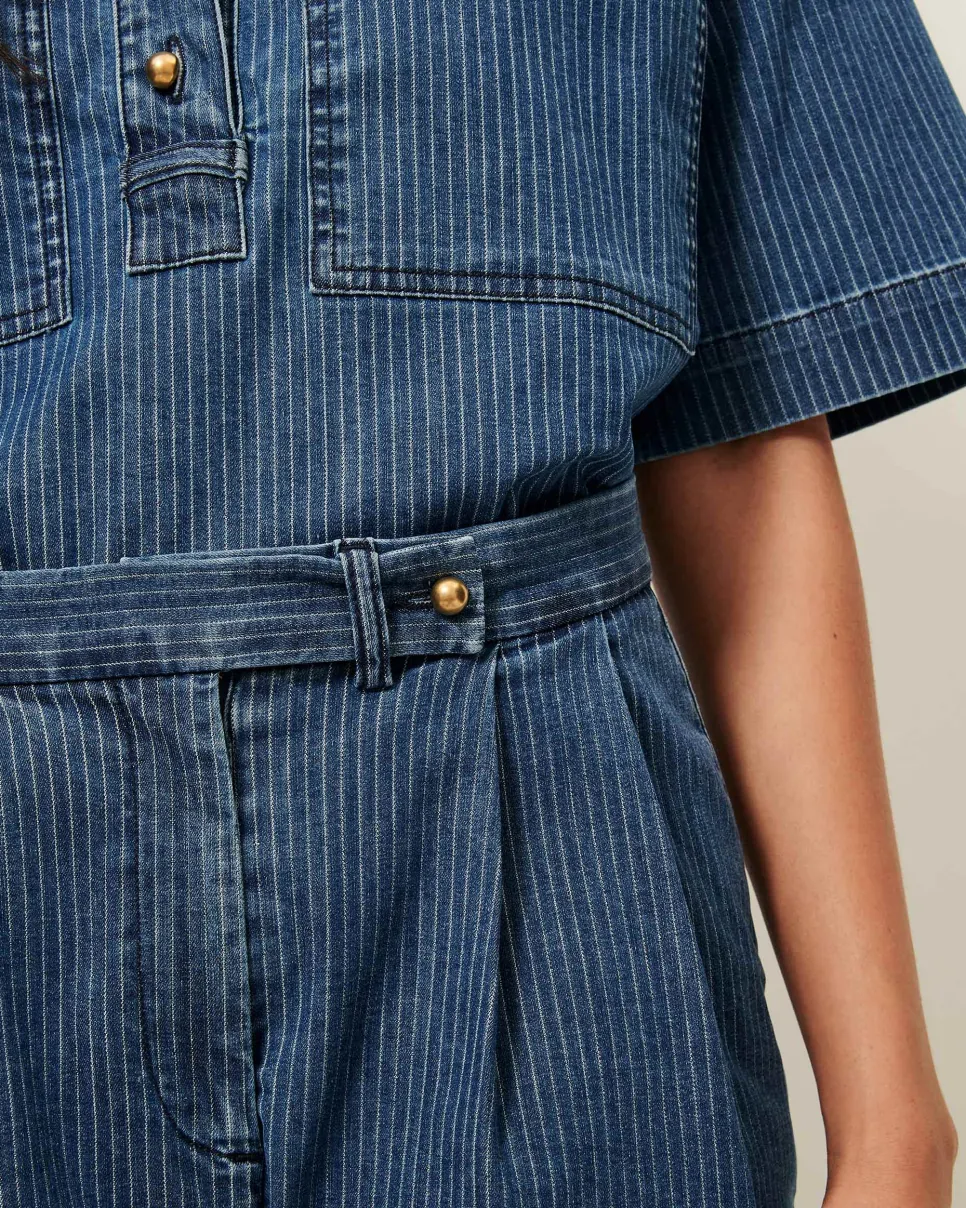 Bermuda à plis en sergé de denim à fils indigo et fines rayures contrastées