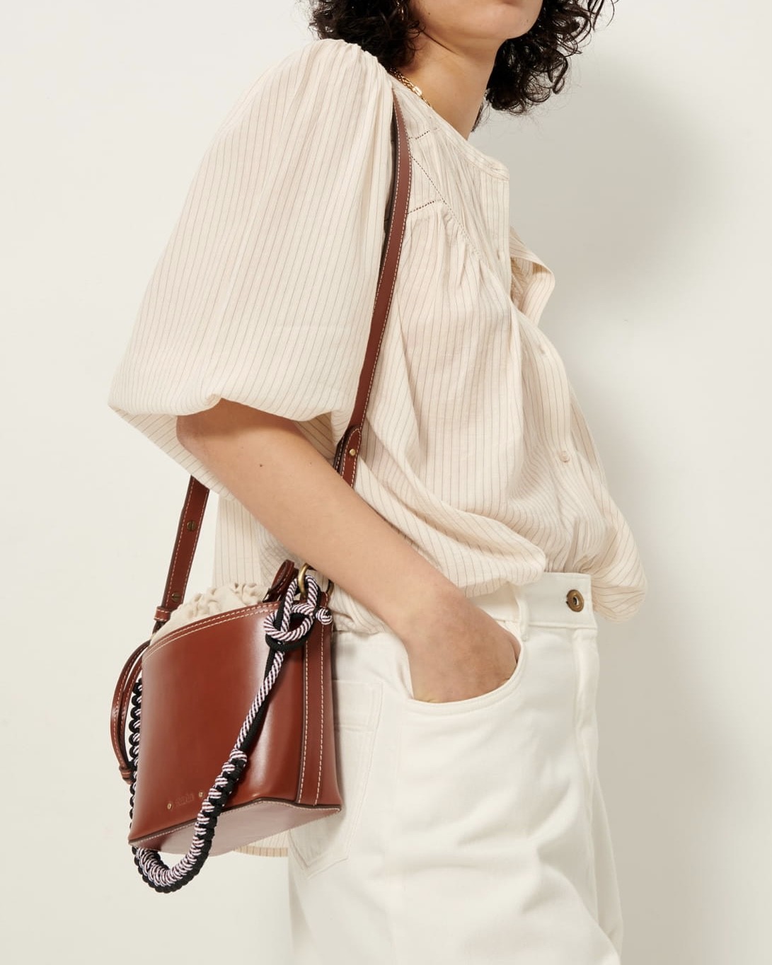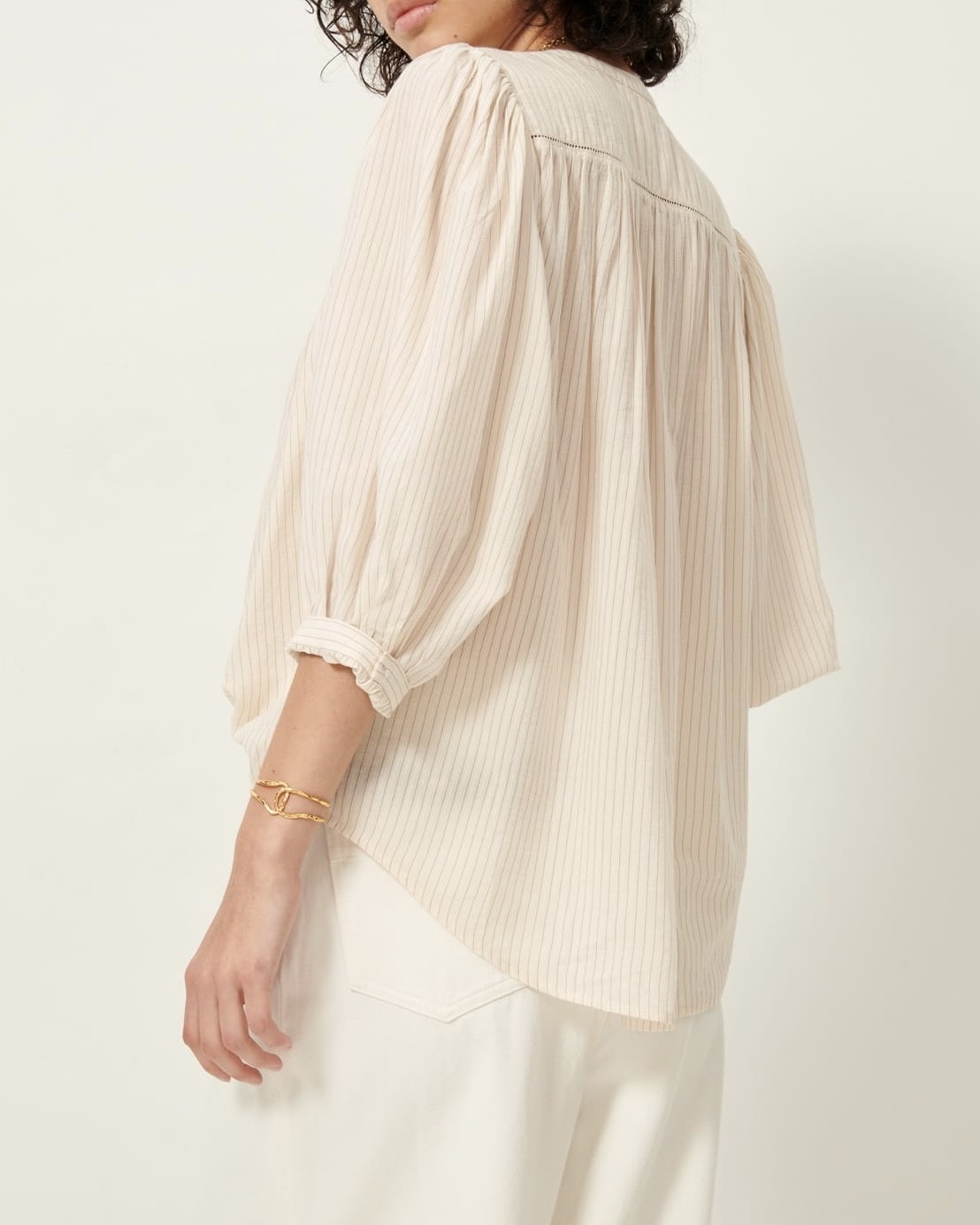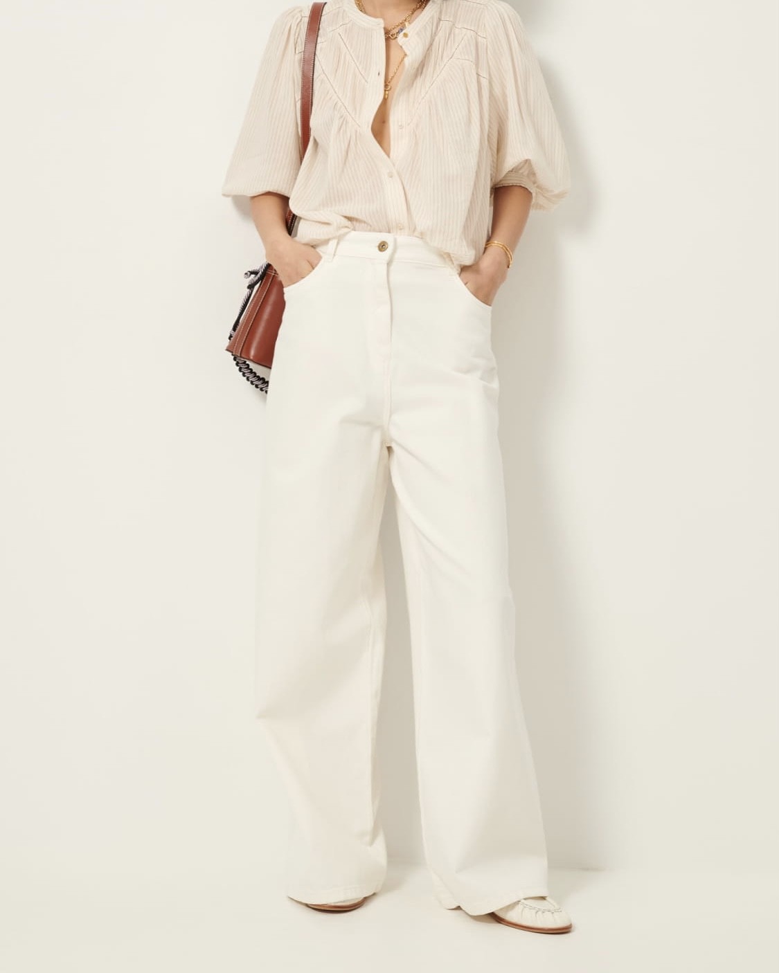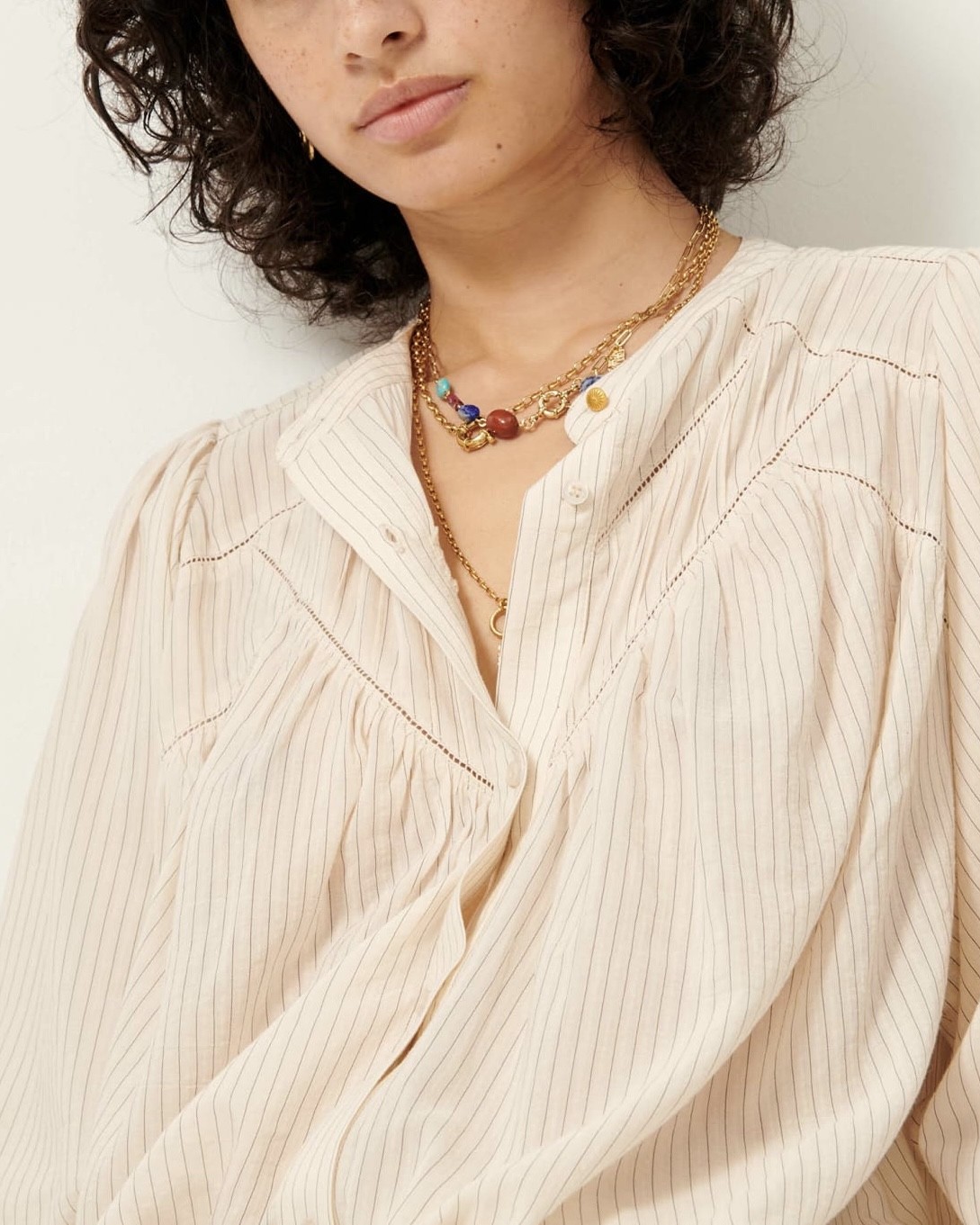 Fermeture boutonnée devant dont un bouton bijou au pied de col.