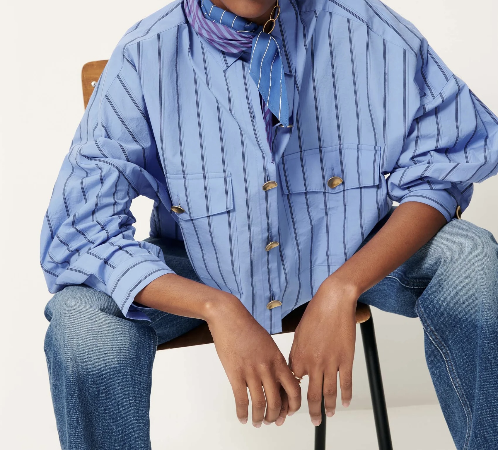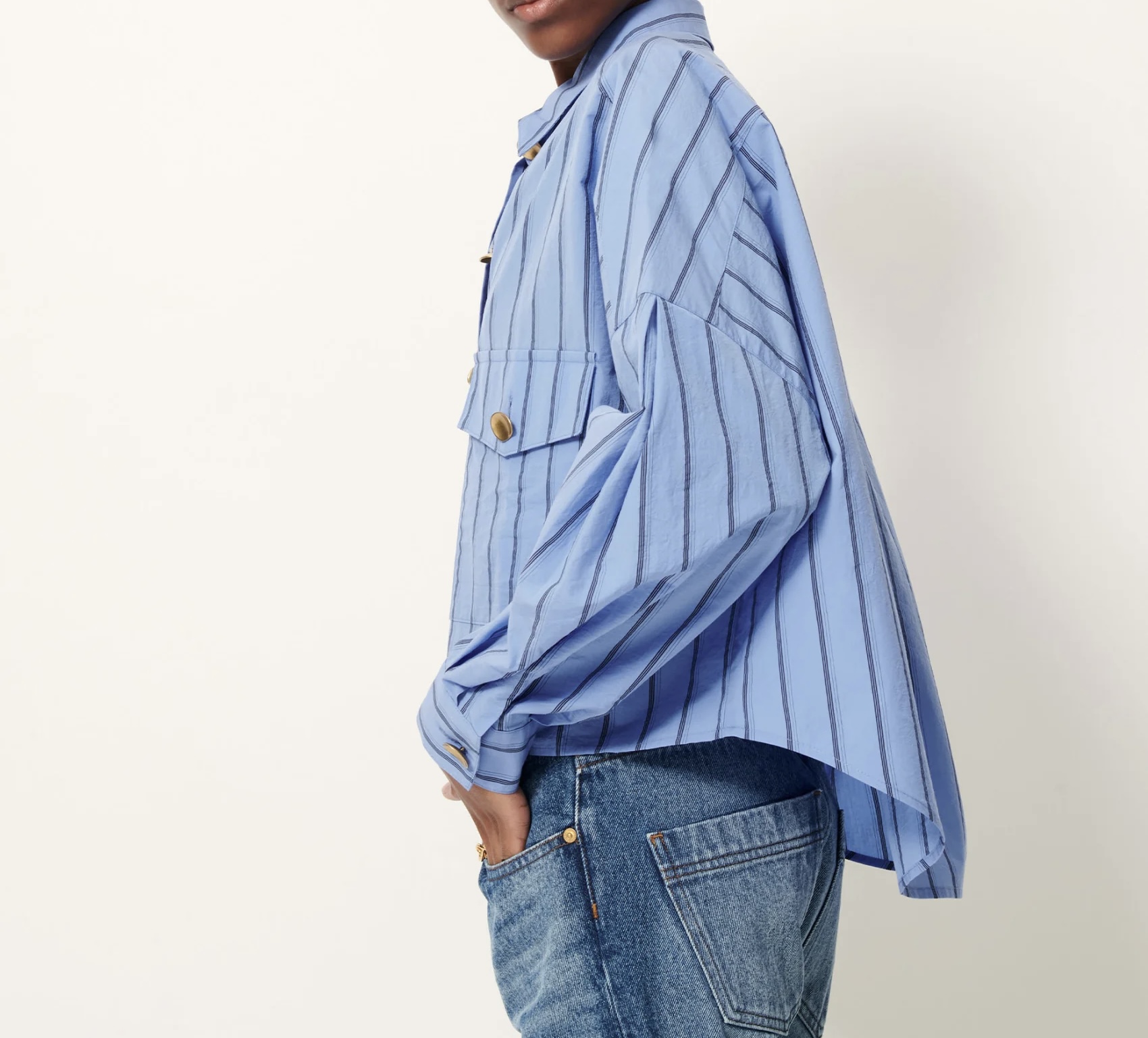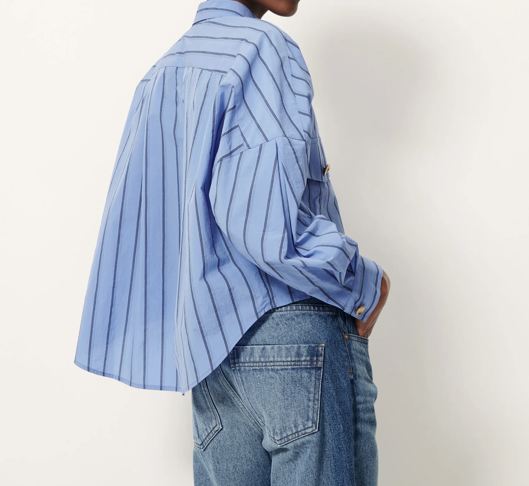 Poches plaquées en popeline craquante à fines rayures contrastées, tissée en Italie, exclusive Sessùn.