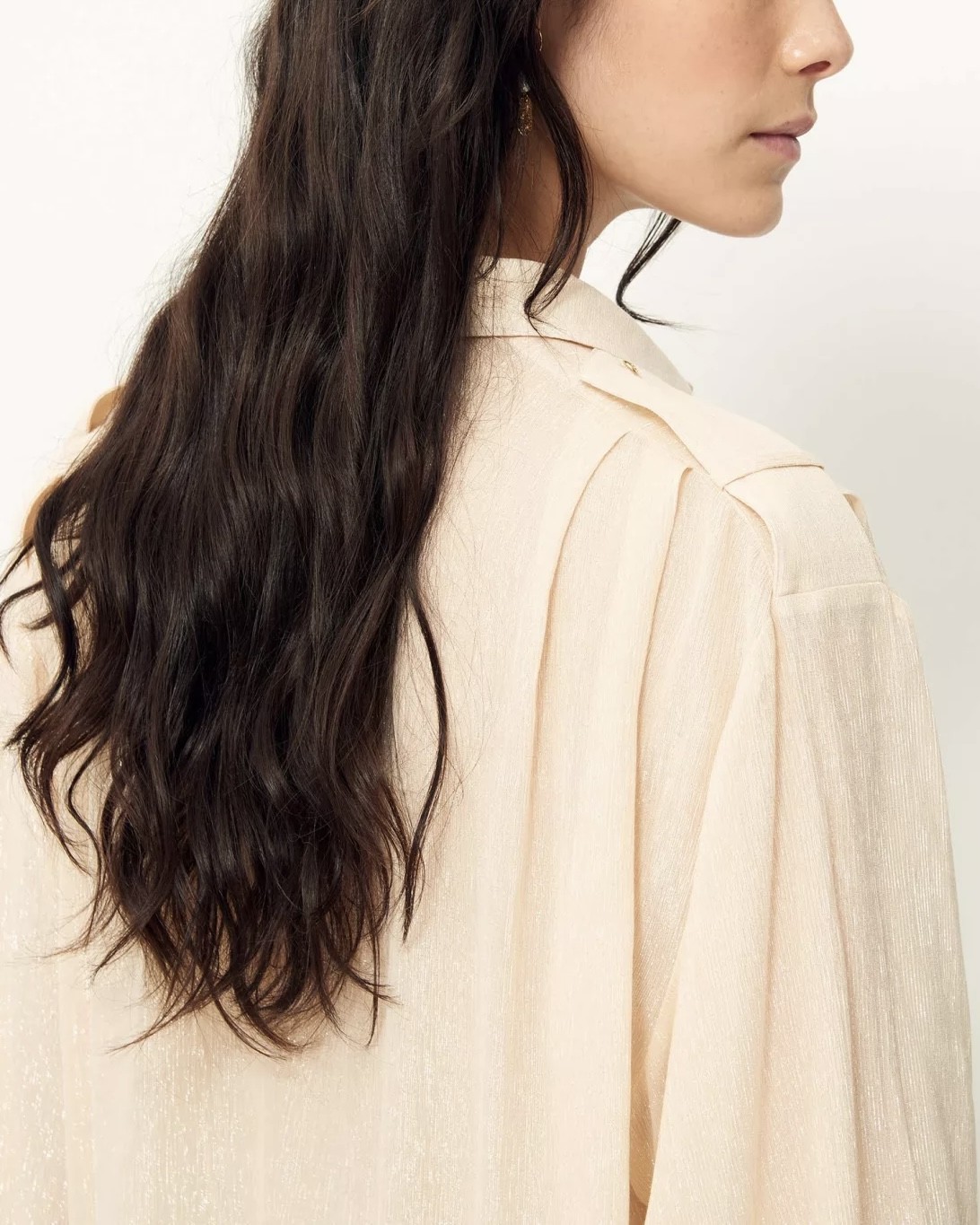 Chemise à pattes épaules en crépon viscose et soie fluide métallisé.