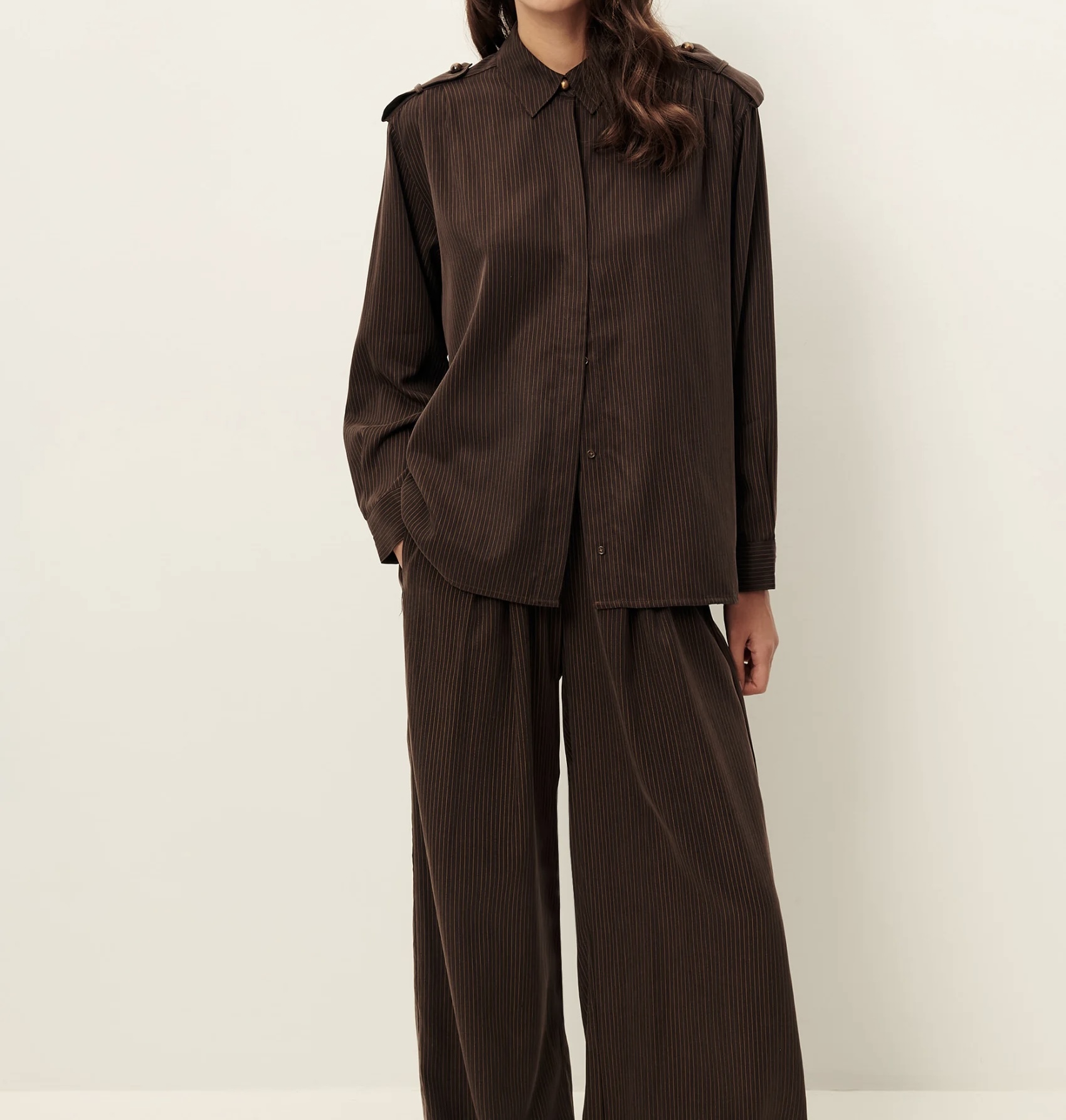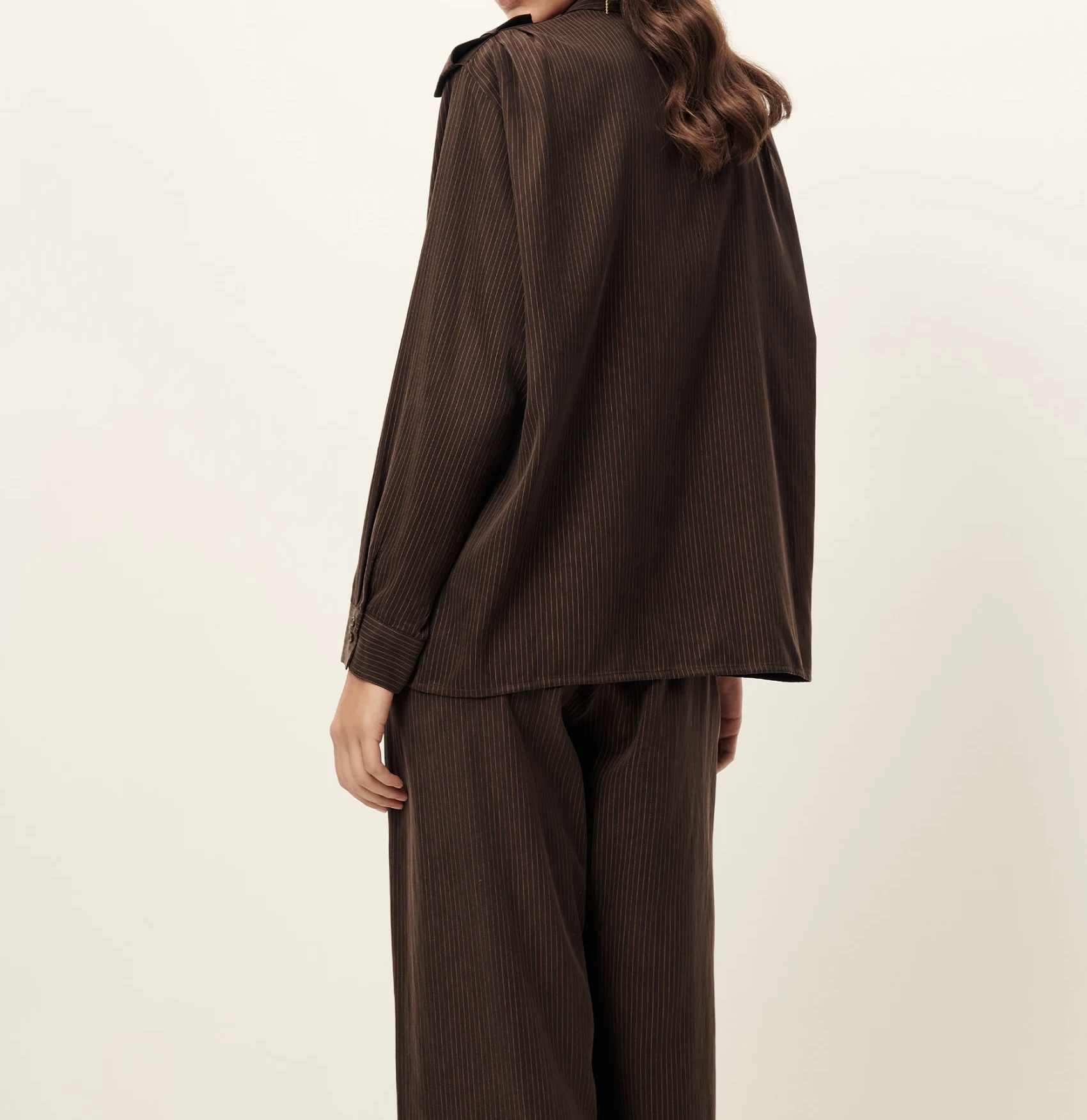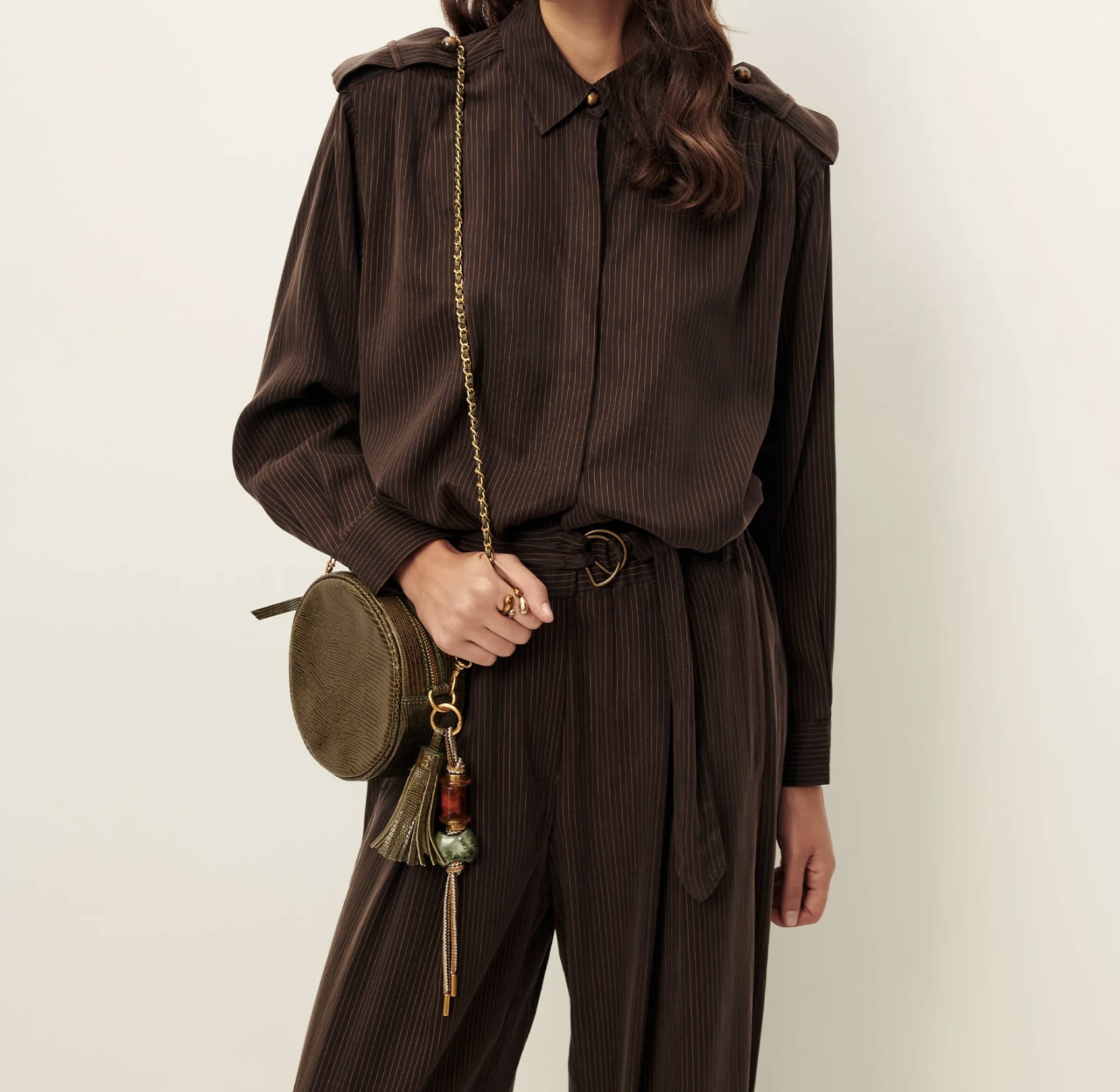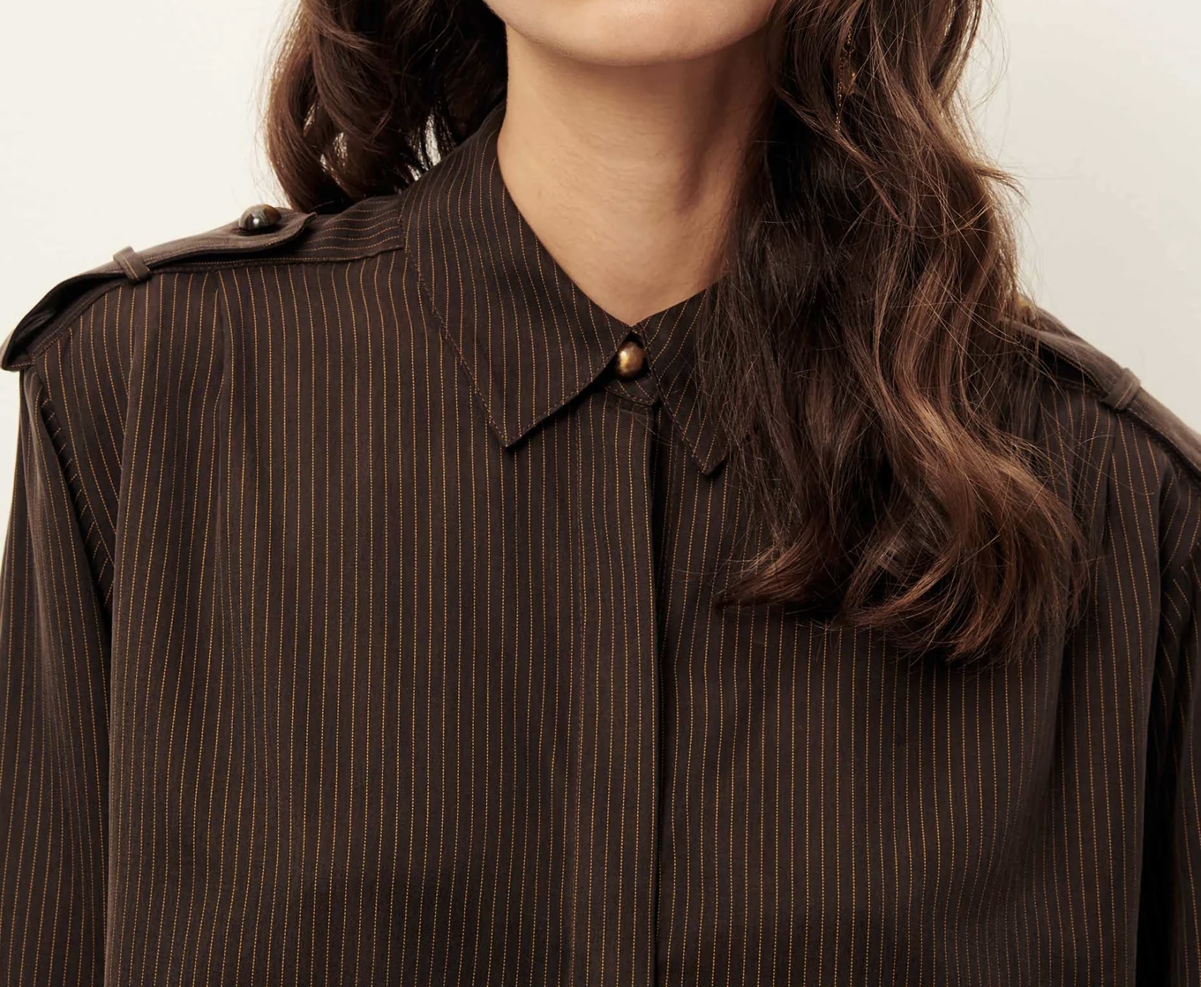 Chemise esprit officier à pattes épaules en satin de cupro rayé.