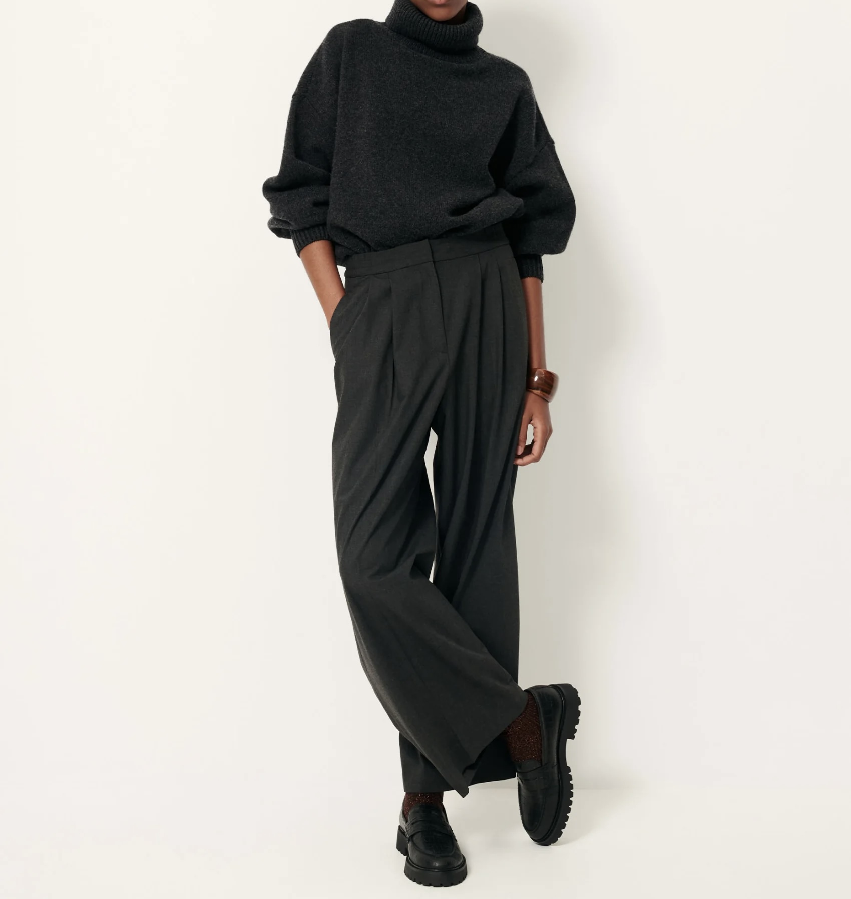 Plis couchés sous la ceinture et détails de plis marqués le long de la jambe.