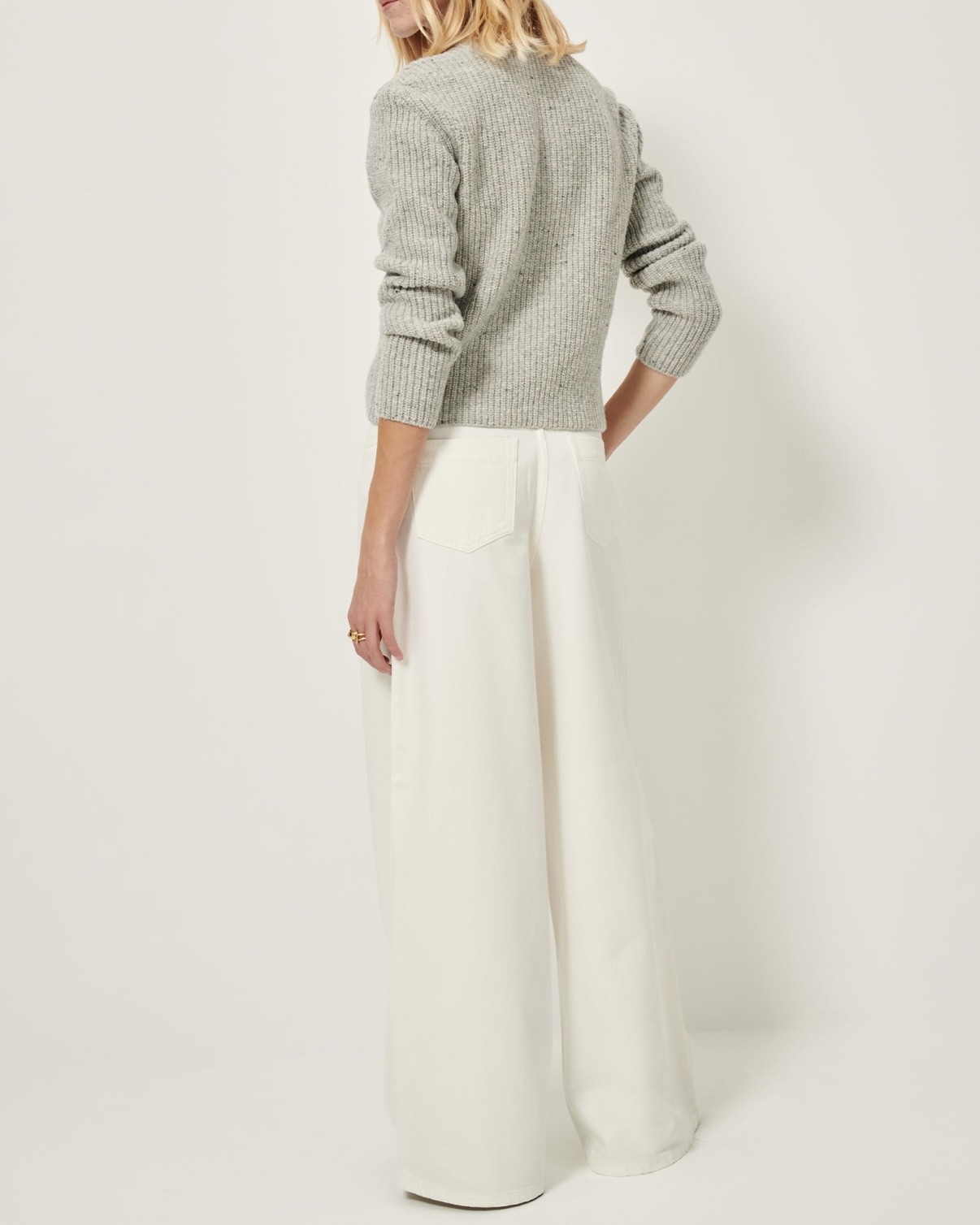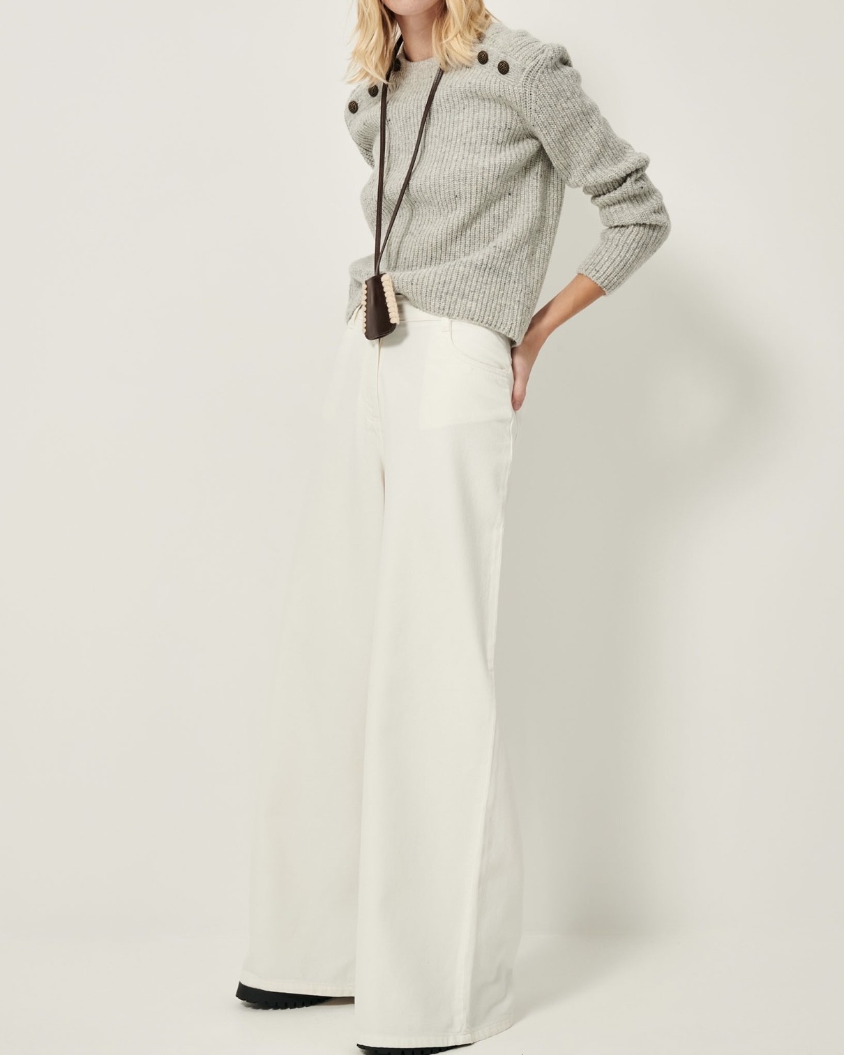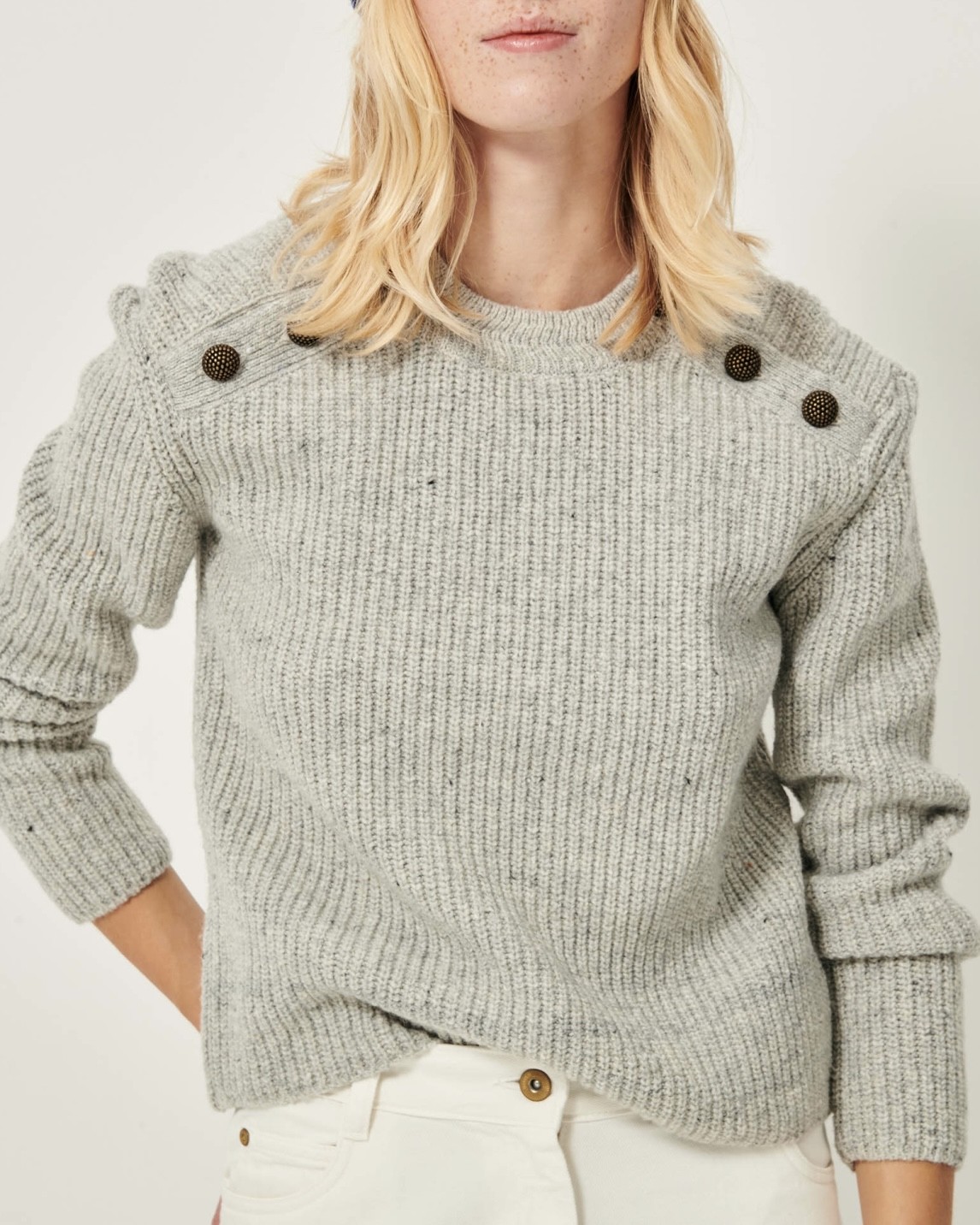 Pull droit aux pattes épaules boutonnées en côtes anglaises duveteuses.