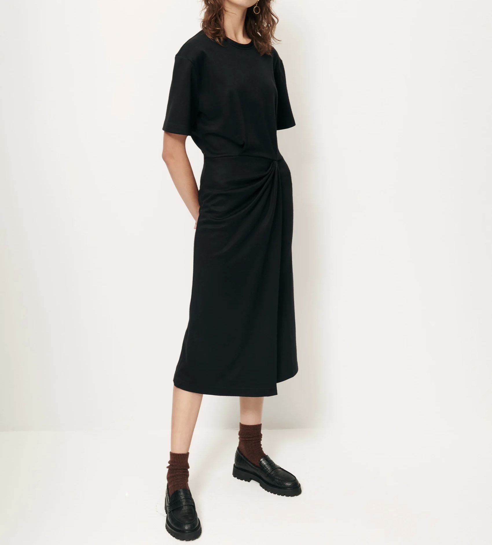 Robe mi-longue drappée à la taille, en maille milano de laine vierge, tissée en Bulgarie.