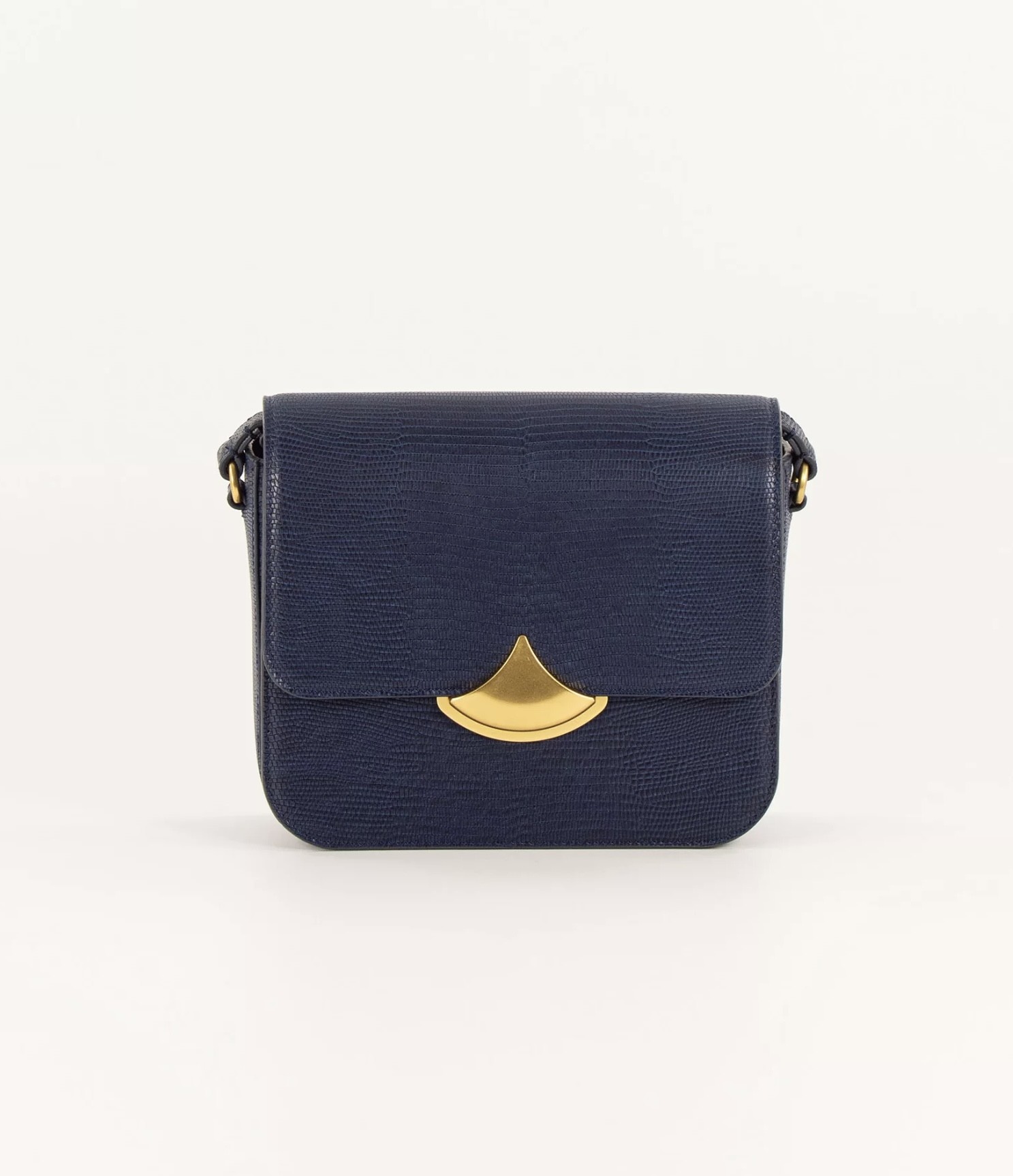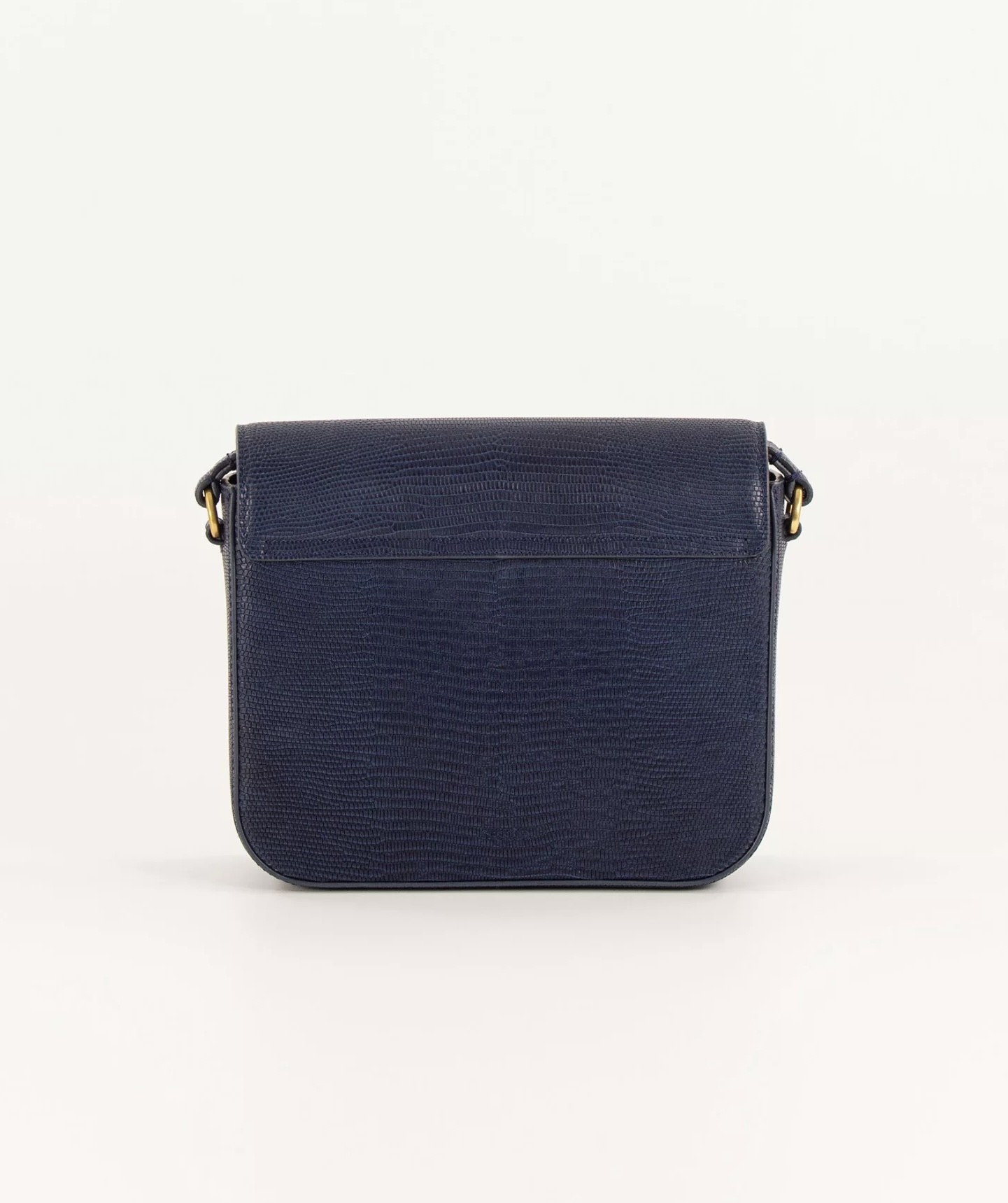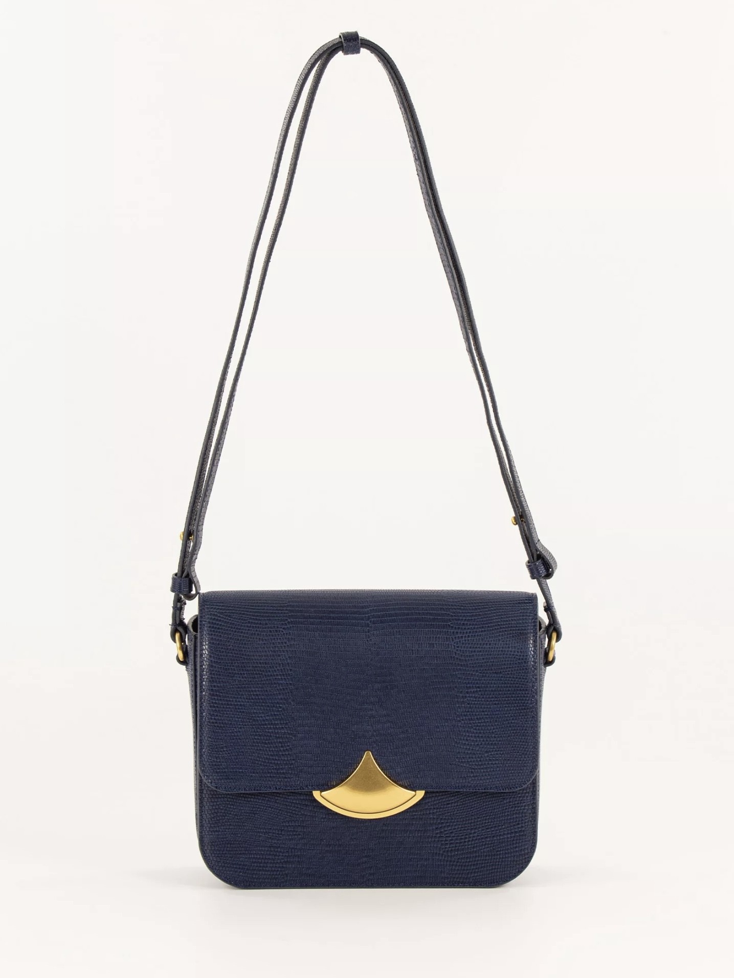 Sac boîte à deux compartiments en cuir de vache imprimé façon lézard.