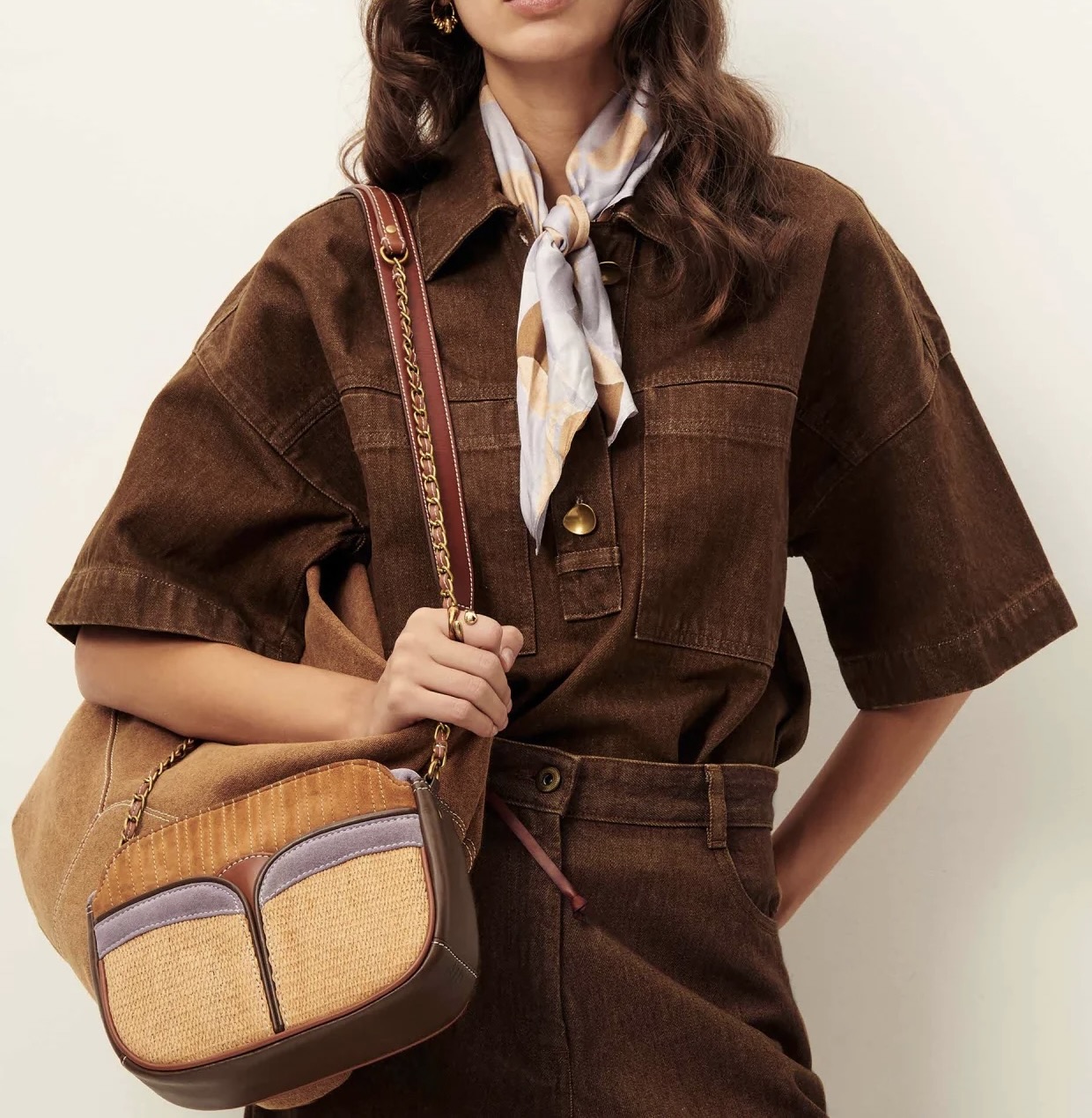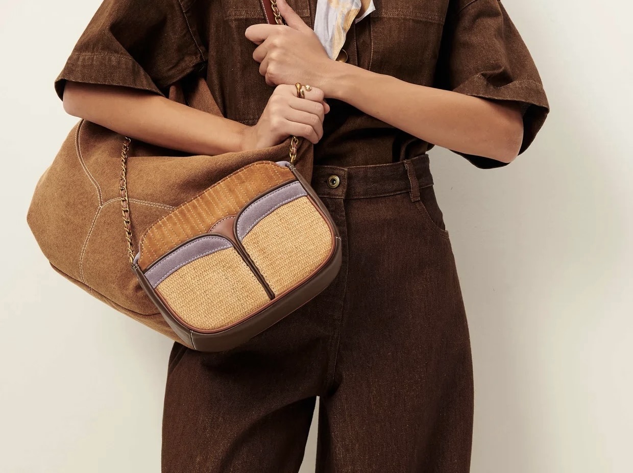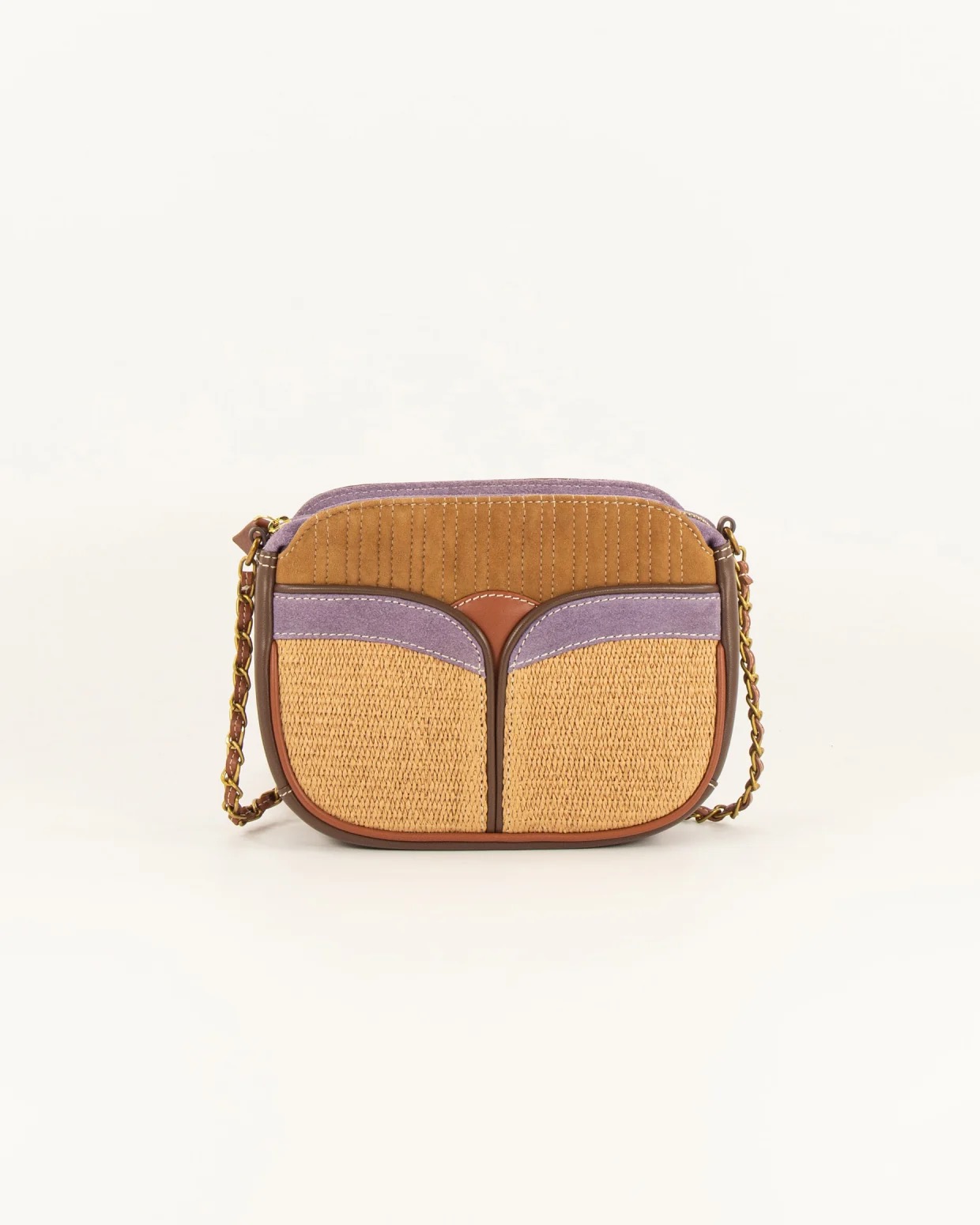 Sac mix matières en cuir d'agneau, avec empiècements raphia et cuir suédé de chèvre. Détails en cuir suédé de vache et cuir de vache.