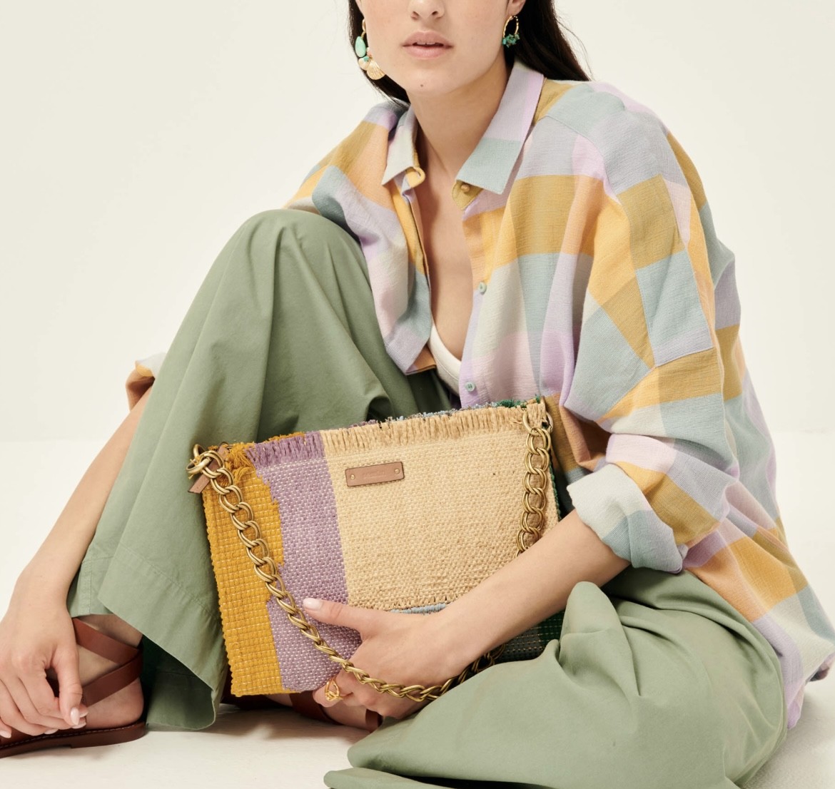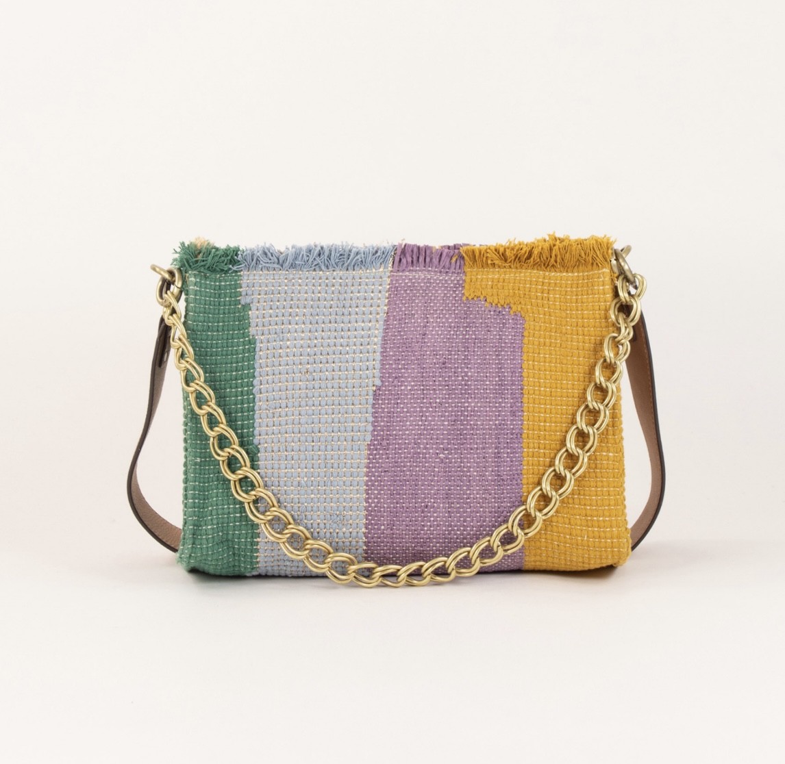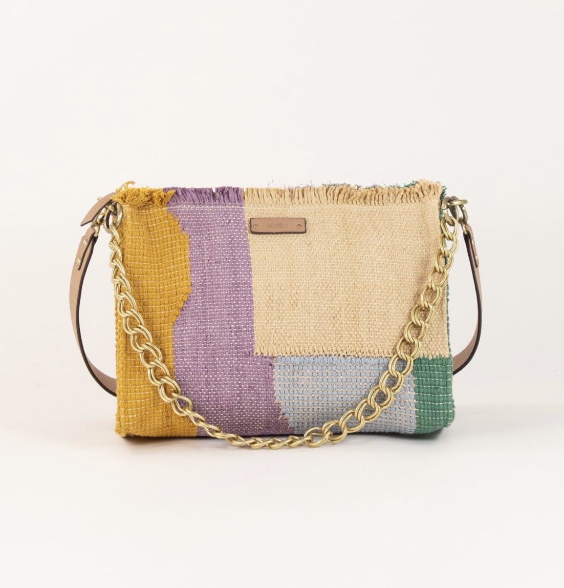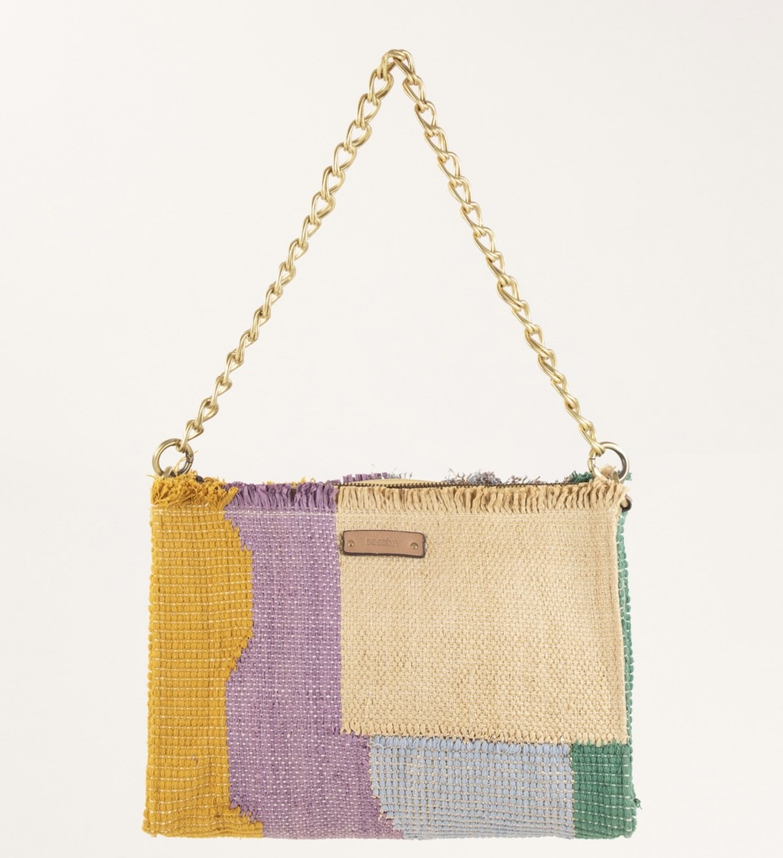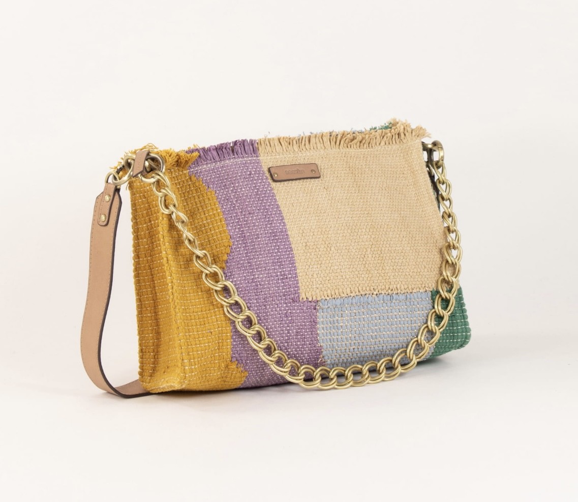 Sac forme pochette en tissage fantaisie coton avec empiècements multicolores