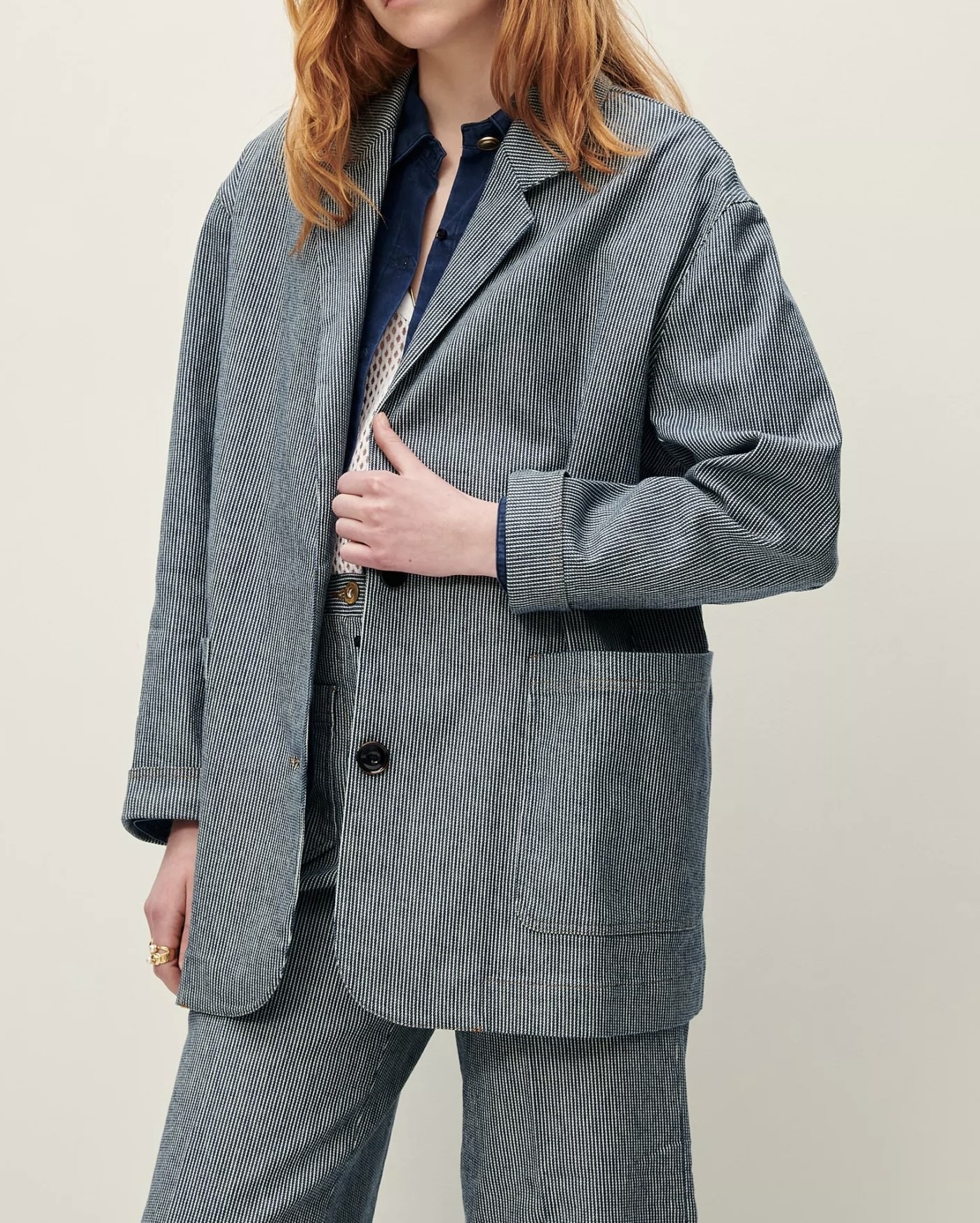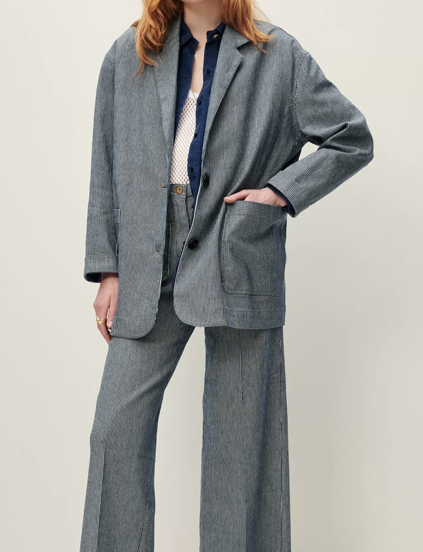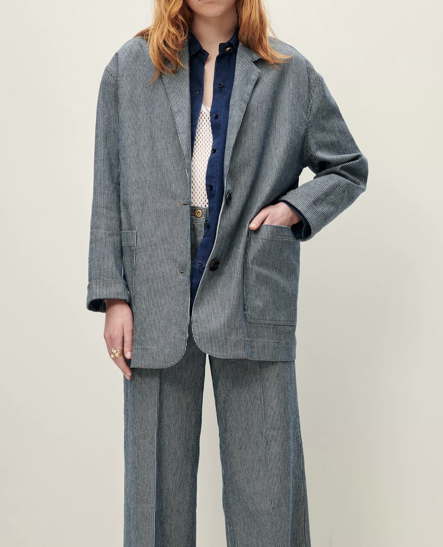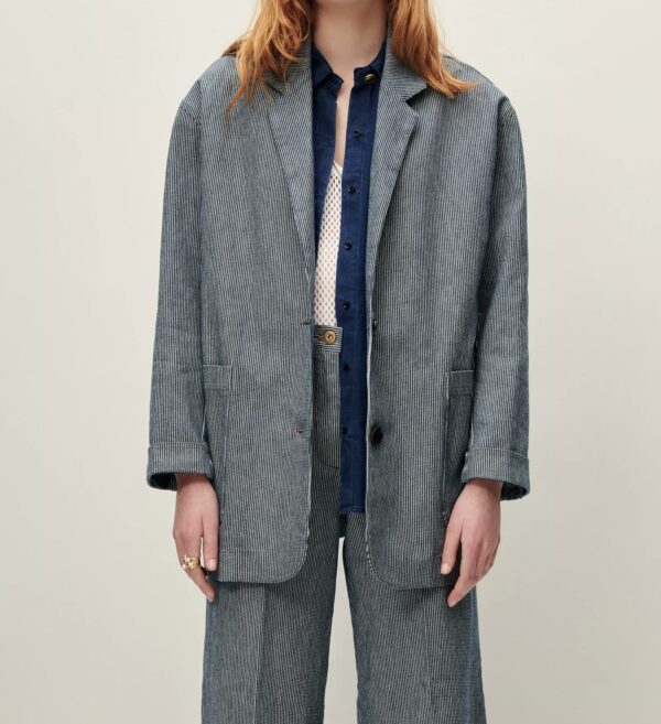 Veste de costume ample non doublée en coutil stretch en sergé 2/1, fils teints en indigo.