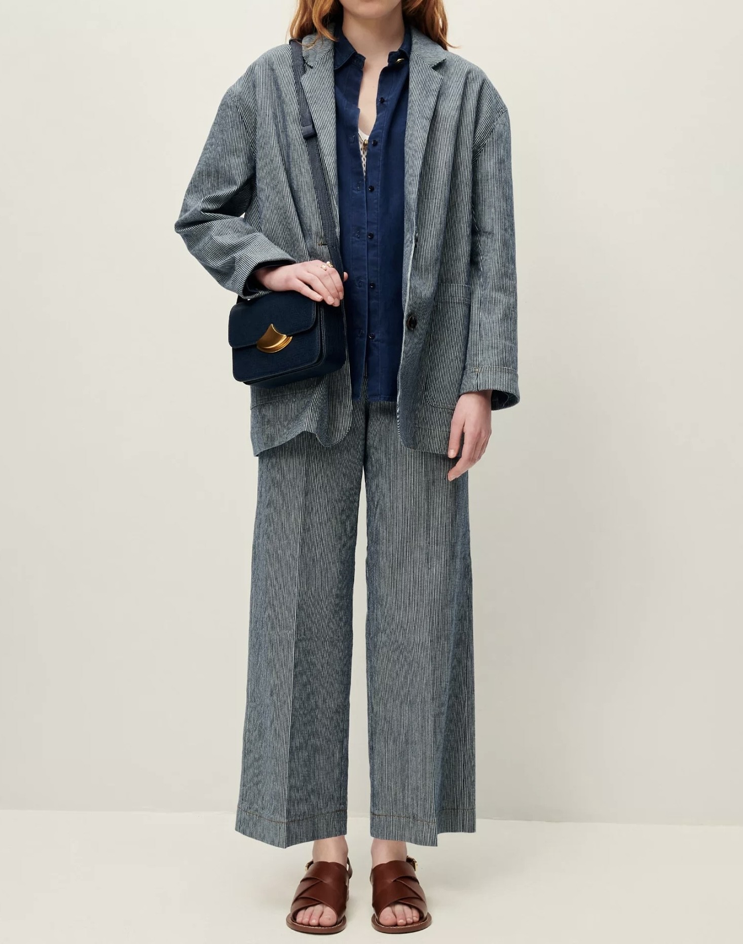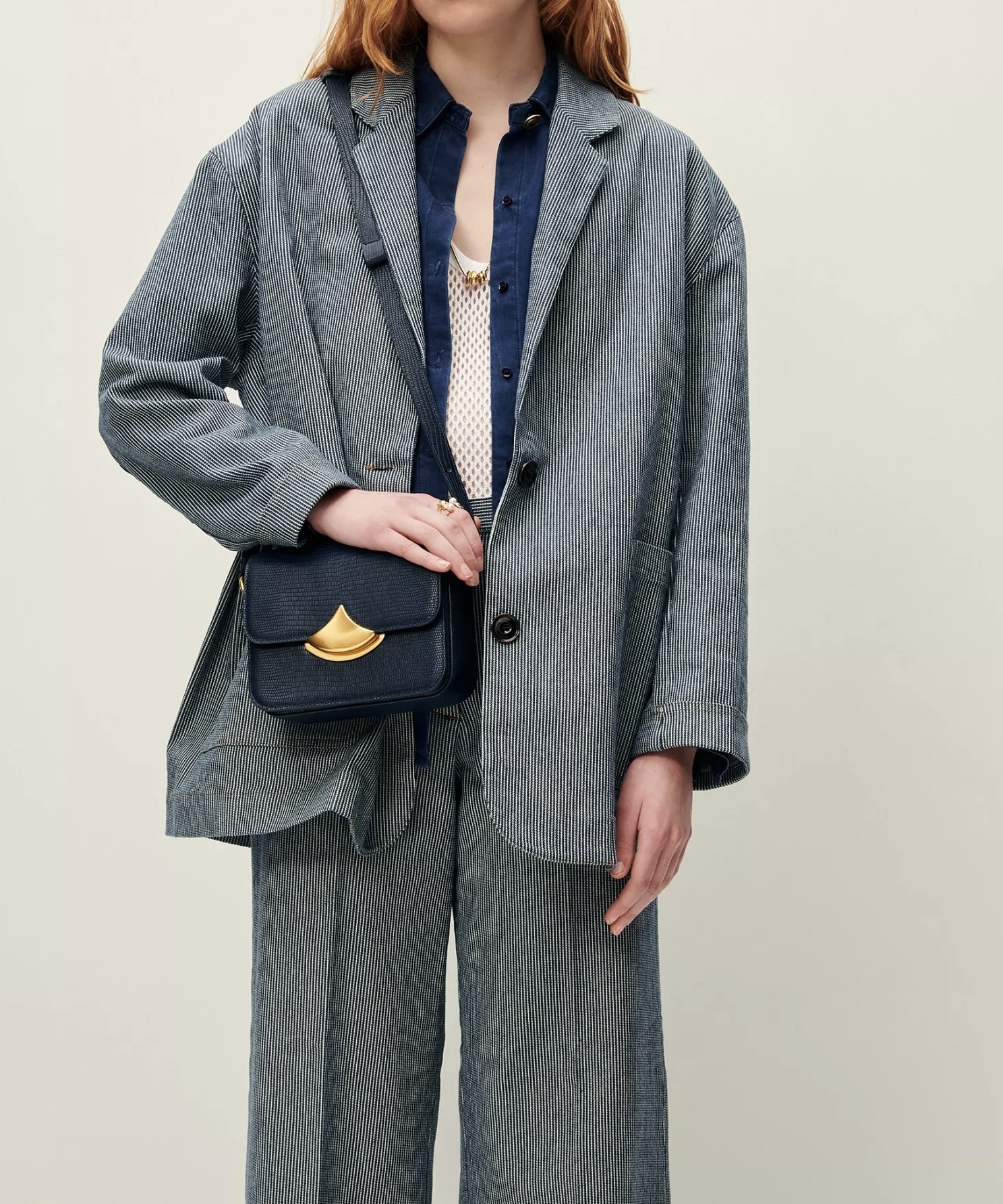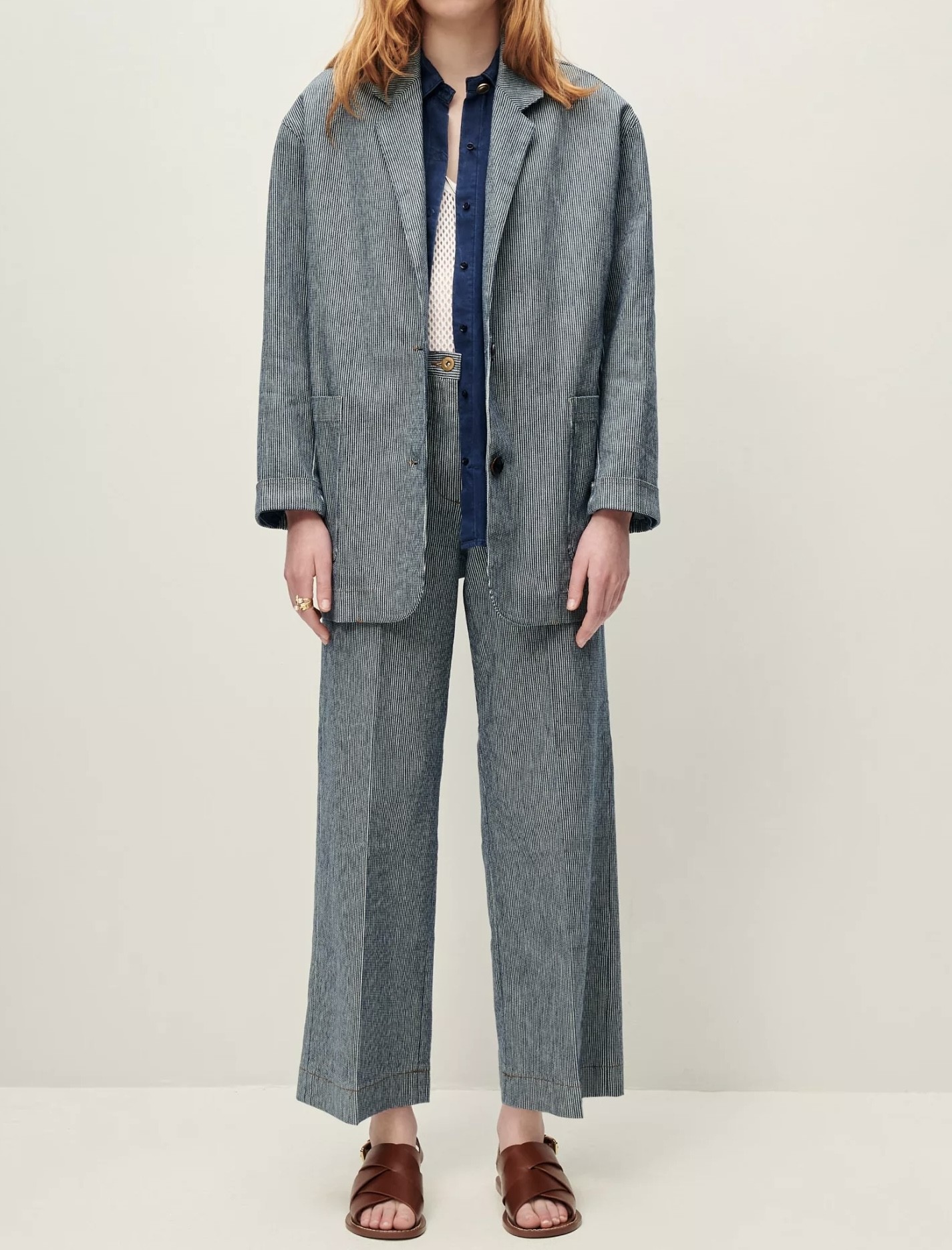 Veste de costume ample non doublée en coutil stretch en sergé 2/1, fils teints en indigo.